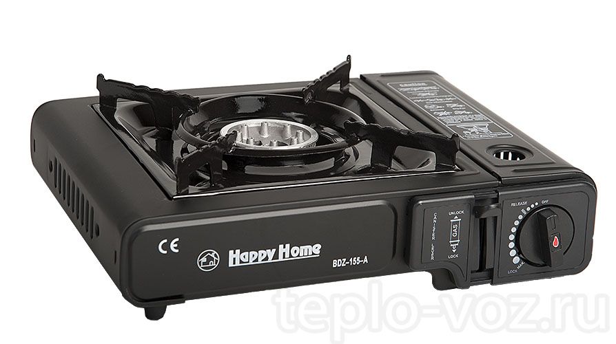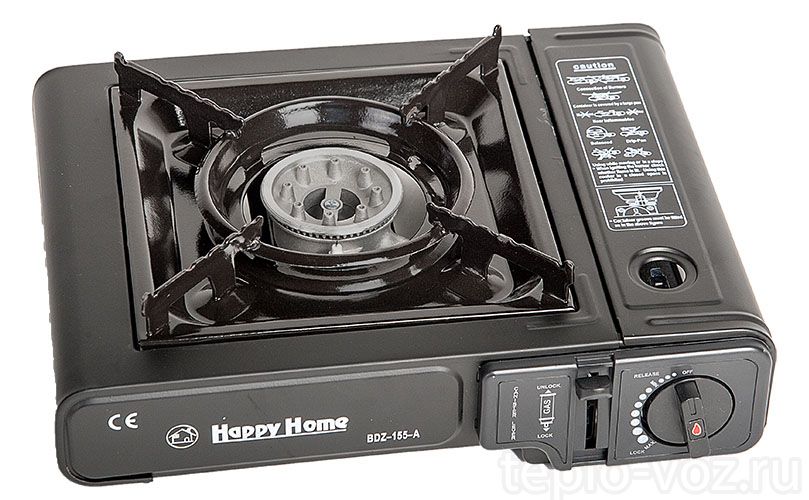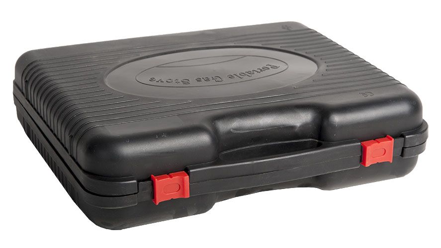 Портативная газовая плитка с пьезорозжигом в кейсе. Может работать от газового баллончика 220гр, который устанавливается в специальный отсек на корпусе плитки. Что бы установить газовый баллон 220гр есть откидная крышка справа на корпусе.